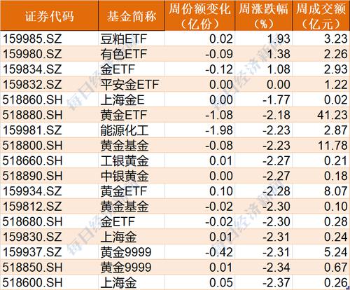 商品ETF本周除豆粕ETF、有色ETF和金ETF上涨逾1%外,其余均出现下跌,黄金相关ETF普跌逾2%。