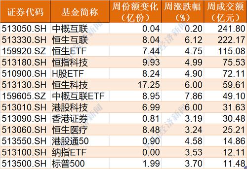 跨境ETF本周成交额大增,其中周成交超过10亿元的有13只,其中中概互联、恒生互联周成交额分别达241.8亿元和222.17亿元,创出历史新高。