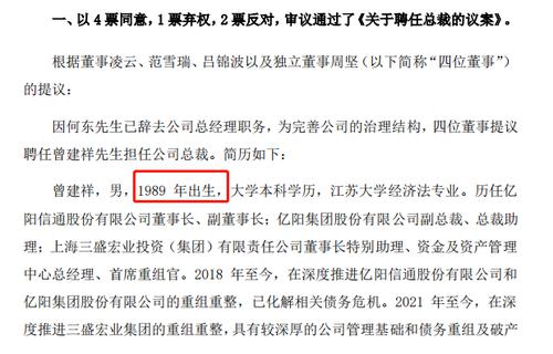当时,该“聘任总裁”议案以4票同意、1票弃权、2票反对的结果审议通过。在董事会上,董事厉群南以不了解新选聘人员的情况为由弃权;独立董事应明德以曾建祥缺乏上市公司管理经验,对上市公司经营业务不熟悉,对公司复杂经营现状缺乏把控度,不适合担任总裁之职为由反对。