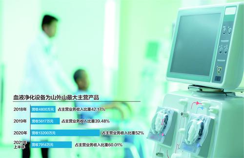 山外山主要收入来源为血液净化设备、血液净化耗材、医疗服务三大业务,其中血液净化设备为最大主营产品,报告期内收入金额分别为4800.38万元、5616.99万元、1.32亿元和7914.40万元,占主营业务收入比重分别为42.17%、39.48%、52%和60.01%。