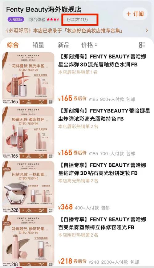 2019年9月,美妆品牌Fenty Beauty宣布正式进军中国市场。并在国内的电商平台开设了Fenty Beauty海外旗舰店,目前该店的粉丝数达到111万,店内明星产品月销量达到7000+,销量最高的产品是修容棒和唇釉,
