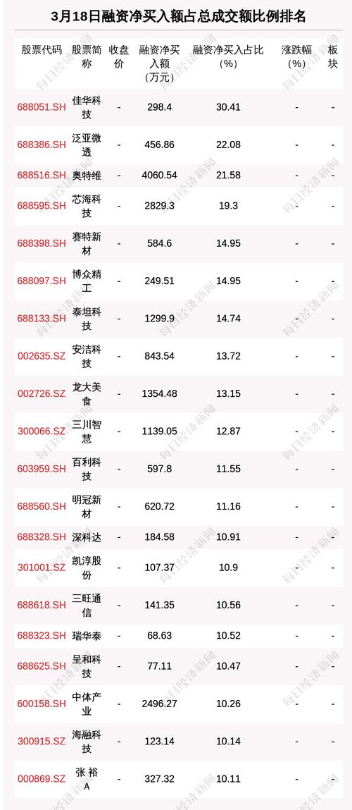 3月18日两市共有897只个股有融资资金净买入。共有21只股票融资净买入额占总成交金额比例超10%,其中佳华科技、泛亚微透、奥特维排名前三,占比分别为30.41%、22.08%、21.58%。