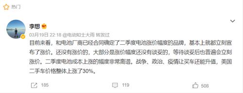 对于近期新能源汽车的涨价潮,理想汽车CEO李想通过社交媒体表示,今年二季度电池成本上涨的幅度“非常离谱”。从目前来看,和电池厂商已经签订合同确定了二季度电池涨价幅度的品牌,基本上都立刻宣布了涨价。还没涨价的品牌,大部分是涨价幅度尚未谈妥,等谈妥后也普遍会立刻涨价。有网友在下方留言称:“电池原材料成本上涨的这波隔山打牛已经传到终端市场了。”