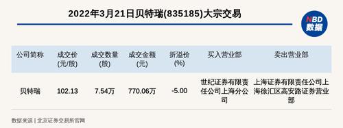 每经讯,2022年3月21日,北交所上市公司贝特瑞(835185)发生一笔大宗交易,成交价102.13元/股,成交数量7.54万股,成交金额770.06万元,折价5%。买入营业部是世纪证券有限责任公司上海分公司,卖出营业部是上海证券有限责任公司上海徐汇区高安路证券营业部。