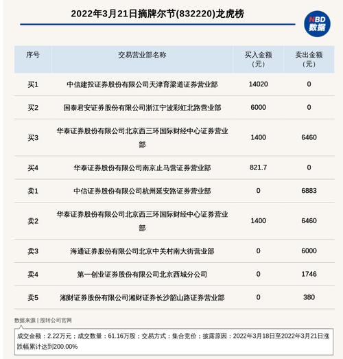 每经讯,2022年3月21日,新三板基础层摘牌尔节(832220)登上龙虎榜,交易方式是集合竞价,披露原因是2022年3月18日至2022年3月21日涨跌幅累计达到200.00%,成交数量61.16万股,成交金额2.22万元。买一席位为中信建投证券股份有限公司天津育梁道证券营业部,买入1.4万元;卖一席位为中信证券股份有限公司杭州延安路证券营业部,卖出6883元。