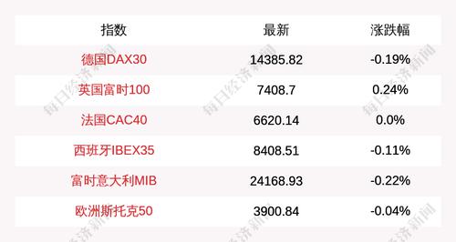 每经AI快讯:北京时间3月21日16:00,德国DAX30指数开盘下跌27.27点,跌幅为0.19%,报14385.82点;英国富时100指数开盘上涨17.84点,涨幅为0.24%,报7422.57点;法国CAC40指数平开,报6620.14点;西班牙IBEX35指数开盘下跌9.09点,跌幅为0.11%,报8408.51点;富时意大利MIB指数开盘下跌53.23点,跌幅为0.22%,报24168.93点;欧洲斯托克50指数开盘下跌1.6点,跌幅为0.04%,报3900.84点。