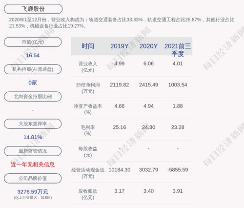 2020年1至12月份,飞鹿股份的营业收入构成为:轨道交通装备占比33.33%,轨道交通工程占比25.87%,其他行业占比21.53%,机械设备行业占比19.27%。