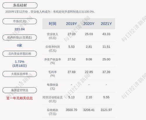 每经AI快讯,东岳硅材(SZ 300821,收盘价:18.42元)3月21日晚间发布年度业绩报告称,2021年营业收入约43.33亿元,同比增加73.1%;归属于上市公司股东的净利润盈利约11.51亿元,同比增加309.87%;基本每股收益盈利0.96元,同比增加284%。分配方案为:每10股派发现金红利3.8元(含税)、不送红股、不转增。