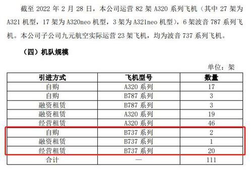 根据上海吉祥航空股份有限公司2022年2月主要运营数据公告显示,截至2022年2月28日,上海吉祥航空股份有限公司及所属子公司九元航空有限公司机队规模为111架飞机,其中波音737系列合计23架,占比约20.7%。