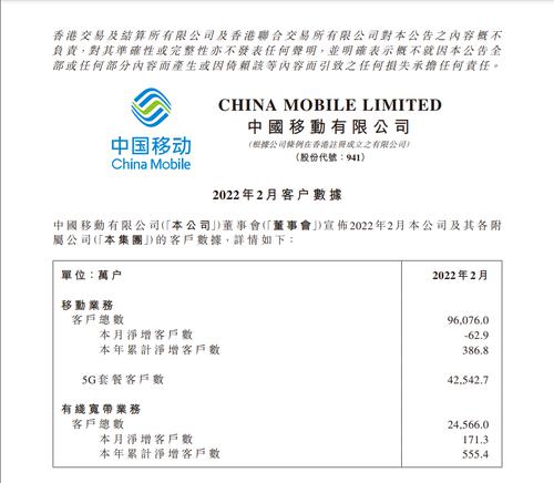 中国移动(00941.HK):2022年2月移动业务净增客户数为-62.9万户,本年累计净增客户数386.8万;5G套餐客户数达4.2542亿;有线宽带业务方面,客户总数约2.46亿户,本月净增客户数171.3万户,本年累计净增客户数555.4万户。