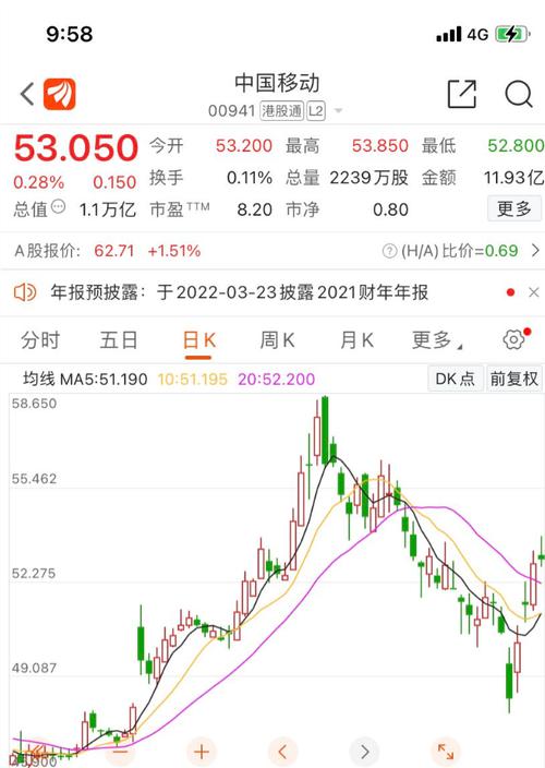截至21日收盘,中国移动港股报收53.05港元,微涨0.28%,最新市值为1.133万亿港元。