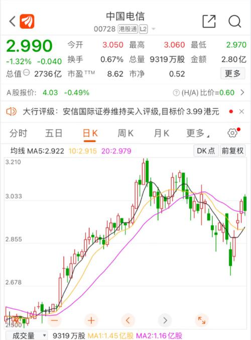截至21日收盘,中国电信港股报收4.03港元,微跌0.49%,最新市值为3688亿港元。