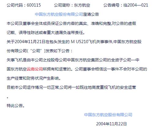 中国东航2004年11月22日曾公告称,失事飞机是由公司之控股母公司中国东方航空集团公司的全资子公司——中国东方航空云南公司所拥有和运营的。