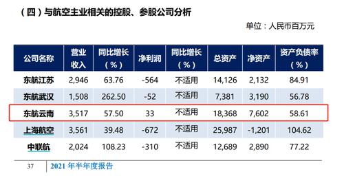 在中国东航与航空主业相关的“控股、参股公司”项下,东航云南2021年上半年营收同比增速并不拔尖,但净利润表现良好,是当期唯一没有亏损的(如下图)。中国东航本身在2021年上半年则亏损52.08亿元。