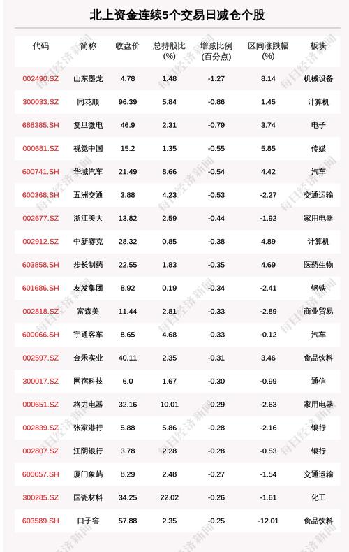 每经AI快讯,3月21日,北上资金连续5个交易日卖出58个股。北上资金连续5个交易日减仓个股中,山东墨龙(002490.SZ,收盘价:4.78元)减持比例增幅最大,5个交易日减持1.27百分点,其他跌幅较大的个股包括同花顺(300033.SZ,收盘价:96.39元)、复旦微电(688385.SH,收盘价:46.9元)、视觉中国(000681.SZ,收盘价:15.2元),分别减持0.86个百分点、0.79个百分点、0.55个百分点。