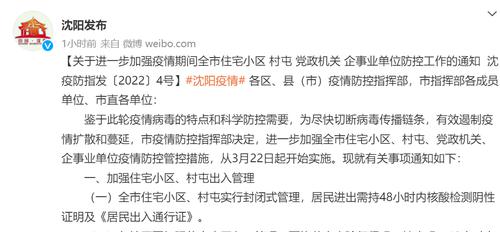据沈阳发布今日早间消息,沈阳市发布“关于进一步加强疫情期间全市住宅小区 村屯 党政机关 企事业单位防控工作的通知 沈疫防指发〔2022〕4号”: