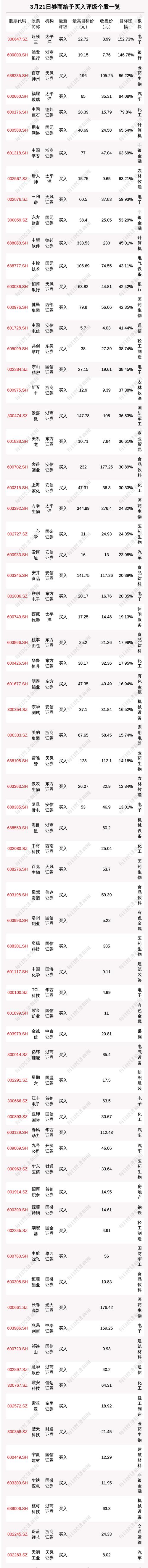 每经AI快讯,3月21日,券商给予评级的个股数共有95只,获得买入评级的个股数共有70只。在公布了目标价格的36只个股中,按照最新收盘价计算,预期涨幅排名居前的个股是超频三(300647.SZ)、浦发银行(600000.SH)、百济神州(688235.SH),预期涨幅分别是152.73%、146.78%、86.22%。