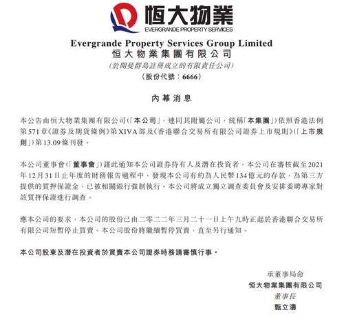 据恒大物业在港交所的公告,公司在审核截至2021年12月31日止年度的财务报告过程中,发现公司有约为人民币134亿元的存款,为第三方提供的质押保证金,已被相关银行强制执行。本公司将成立独立调查委员会及安排委聘专家对该质押保证进行调查。
