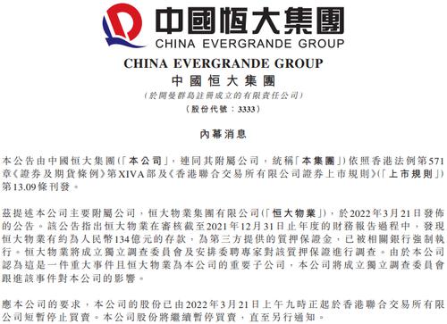 3月22日早间,港股中国恒大、恒大物业、恒大汽车同时发布“内幕消息”相关公告,3家公司同时公告预计延迟刊发2021年经审核业绩,3股继续停牌。