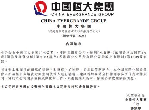 此外,中国恒大公告称,考虑到本集团目前面临的经营上和财务上的挑战,尤其是债务压力,本公司风险化解委员会正在积极研究解决方案并与债权人进行沟通,建议增加聘请金杜律师事务所作为法律顾问,协助本公司开展债务风险化解工作,跟进债权人诉求,依法公平处理债务问题。