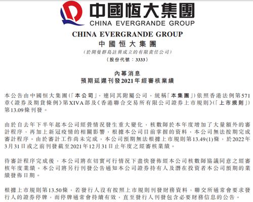 此外,中国恒大、恒大汽车、恒大物业同时公告,预计延迟刊发2021年经审核业绩。