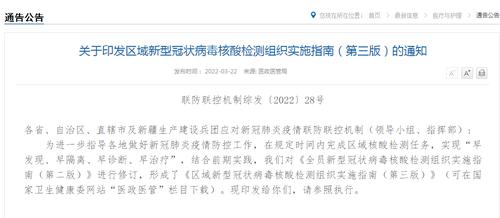 据卫健委官网3月22日消息,,国务院联防联控机制综合组对《全员新型冠状病毒核酸检测组织实施指南(第二版)》进行了修改完善,形成了《区域新型冠状病毒核酸检测组织实施指南(第三版)》。