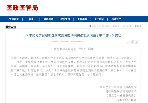 据国家卫健委官网3月22日消息,为进一步指导地方做好区域新型冠状病毒核酸检测工作,国务院联防联控机制综合组对《全员新型冠状病毒核酸检测组织实施指南(第二版)》进行了修改完善,形成了《区域新型冠状病毒核酸检测组织实施指南(第三版)》(以下简称《指南》)。
