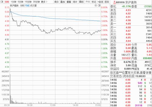 高铁股京沪高铁早盘一度大涨超6%,收盘上涨1.66%。