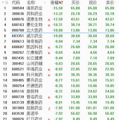 从跌幅榜来看,新冠医药股出现重挫,如北大医药跌停。