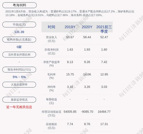 2021年1至6月份,粤海饲料的营业收入构成为:普通虾料占比19.17%,普通水产配合饲料占比17.2%,海鲈鱼料占比13.18%,金鲳鱼料占比13.01%,乌鳢料占比7.36%,海水鱼料-其他占比7.03%。