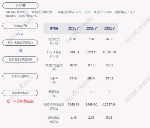 2021年1至12月份,大地熊的营业收入构成为:工业电机占比40.53%,汽车工业占比18.56%,消费类电子占比18.18%,其他占比8.3%。