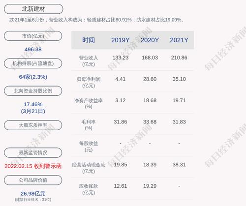 每经AI快讯,北新建材(SZ 000786,收盘价:29.38元)3月22日晚间发布年度业绩报告称,2021年营业收入约210.86亿元,同比增加25.15%;归属于上市公司股东的净利润盈利约35.1亿元,同比增加22.67%;基本每股收益盈利2.078元,同比增加22.67%。分配方案为:每10股派发现金红利6.55元(含税)、不送红股、不转增。