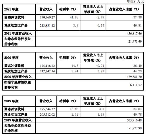 2021年年报显示,ST维维实现营业收入45.68亿元,同比减少4.81%,2020年、2021年连续两年出现同比下滑。从主营业务产品情况看,主要营收来自粮食初加工产品21.38亿元、固态冲调饮料17.08亿元、动植物蛋白液体饮料4.9亿元等,分别占营业收入的46.8%、37.39%、10.73%。