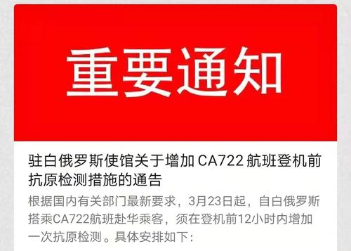据中国驻白俄罗斯大使馆微信号消息,根据国内有关部门最新要求,3月23日起,自白俄罗斯搭乘CA722航班赴华乘客,须在登机前12小时内增加一次抗原检测。具体安排如下: