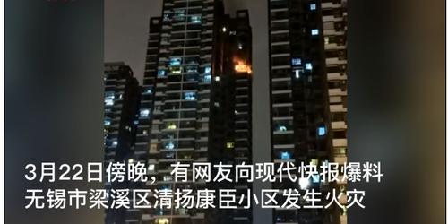 另据现代快报,“火很大,现场还有火星直往下掉 ……”3月22日傍晚,有网友向现代快报爆料无锡市梁溪区清扬康臣小区发生火灾,现场浓烟滚滚。