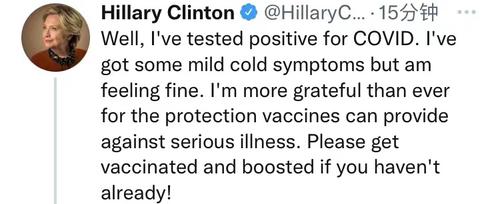 此外,据央视新闻最新消息,当地时间22日,美国前国务卿希拉里·克林顿新冠病毒检测呈阳性,其本人称目前状态良好。