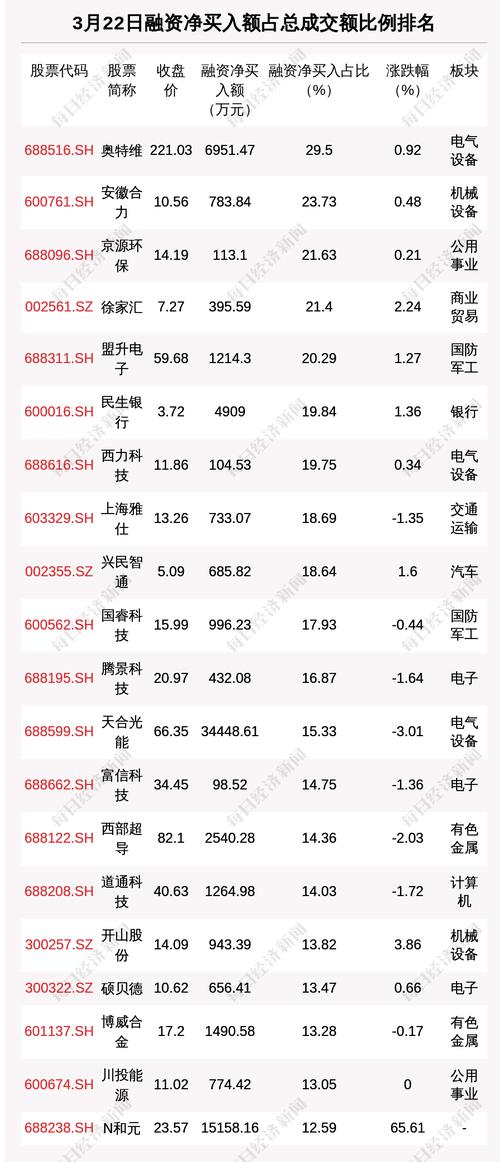 3月22日两市共有1104只个股有融资资金净买入。共有41只股票融资净买入额占总成交金额比例超10%,其中奥特维、安徽合力、京源环保排名前三,占比分别为29.5%、23.73%、21.63%。