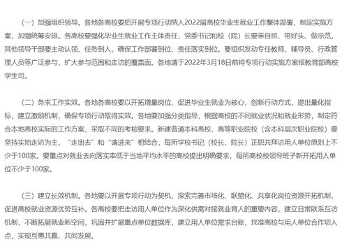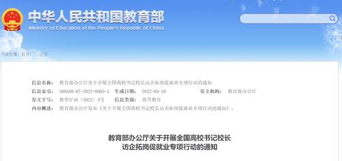 近日,教育部网站刊发“教育部办公厅关于开展全国高校书记校长访企拓岗促就业专项行动的通知”,通知指出,各地各高校要以开拓增量岗位、促进毕业生就业为核心,创新行动方式,提出量化指标,建立激励机制,确保专项行动取得实效。各地要加强分类指导,根据高校的不同就业状况和就业形势,制定符合本地高校实际的工作方案,采取不同的考核要求。新建普通本科高校、高等职业院校(含本科层次职业院校)要坚持实地走访为主,“走出去”和“请进来”相结合,每所学校书记(校长、院长)正职共拜访用人单位原则上不少于100家。要重点对就业去向落实率低于当地平均水平的高校提出明确要求,每所高校校领导班子新开拓用人单位不少于100家。