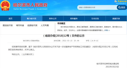 据哈尔滨市人民政府网站3月23日消息,经报请市政府同意,鉴于《哈尔滨市人民政府办公厅关于进一步加强房地产市场调控工作的通知》(哈政办规[2018]12号)已完成其阶段性调控使命,拟予以废止。