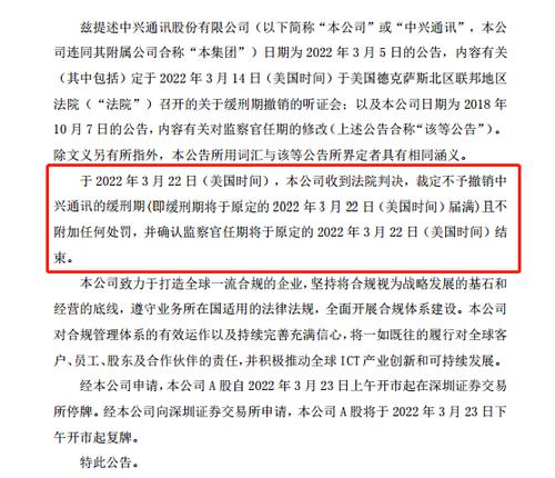 中兴通讯3月23日午间公告,兹提述中兴通讯股份有限公司(以下简称“本公司”或“中兴通讯”,本公司连同其附属公司合称“本集团”)日期为2022年3月5日的公告,内容有关(其中包括)定于2022年3月14日(美国时间)于美国德克萨斯北区联邦地区法院(“法院”)召开的关于缓刑期撤销的听证会;以及本公司日期为2018年10月7日的公告,内容有关对监察官任期的修改(上述公告合称“该等公告”)。除文义另有所指外,本公告所用词汇与该等公告所界定者具有相同涵义。