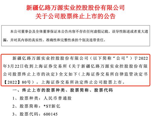 3月22日晚间,*ST新亿(600145)公告,上交所决定终止公司股票上市,公司股票将于3月30日复牌并进入退市整理期交易,退市整理期为15个交易日。意味着,*ST新亿将成为2022年内A股首只退市股。