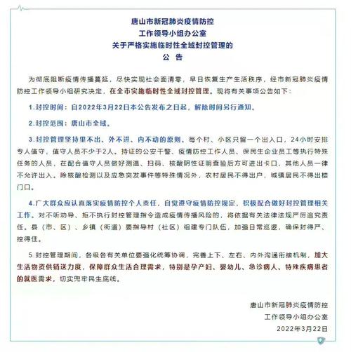 3月22日,唐山市新冠肺炎疫情防控工作领导小组研究决定, 在全市实施临时性全域封控管理 。现将有关事项公告如下: