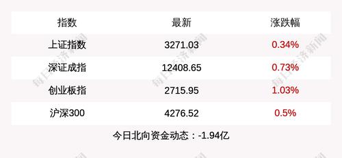 每经AI快讯:北京时间3月23日15:00,上证指数收盘上涨11.17点,涨幅为0.34%,报收3271.03点,成交额4054.22亿元;深证成指收盘上涨89.87点,涨幅为0.73%,报收12408.65点,成交额5373.95亿元;创业板指收盘上涨27.72点,涨幅为1.03%,报收2715.95点,成交额2069.71亿元;沪深300收盘上涨21.22点,涨幅为0.5%,报收4276.52点,成交额2263.91亿元。北上资金当日净流出1.94亿元。