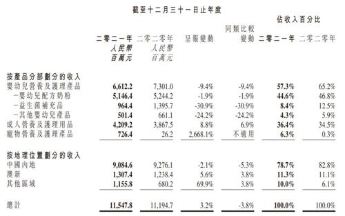 年报显示,2021年,中国内地为健合集团贡献收入90.85亿元,尽管较上年同期下滑5.3%,依然是该集团最大的收入来源,占总收入的78.7%。健合集团称,中国内地收入下滑则是由于婴幼儿营养及护理产品销售额下降,其中主要归因于益生菌销售额下降。