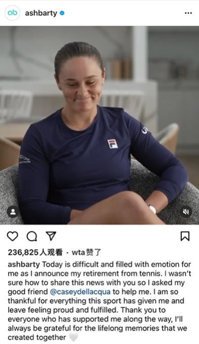 艾什莉•巴蒂宣布退役 图片来源:个人社交媒体截图