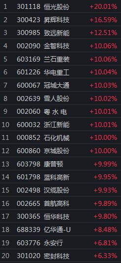 截至午盘,氢能源概念股中恒光股份、金智科技、兰石重装、华电重工、冠城大通、雪人股份、粤水电、浙江新能、石化机械、京城股份等超10股收获涨停。