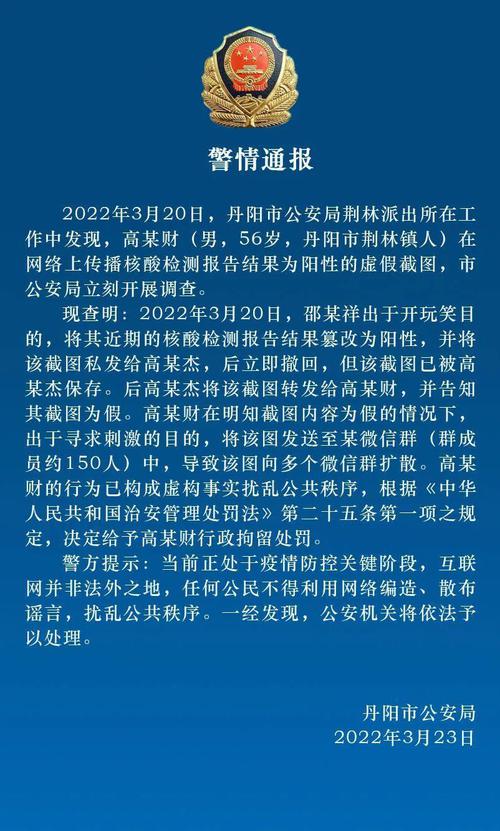 据丹阳公安微信公众号3月23日消息,3月20日,江苏丹阳市公安局荆林派出所在工作中发现,高某财在网络上传播核酸检测报告结果为阳性的虚假截图,丹阳市公安局立刻开展调查,调查结果如下: