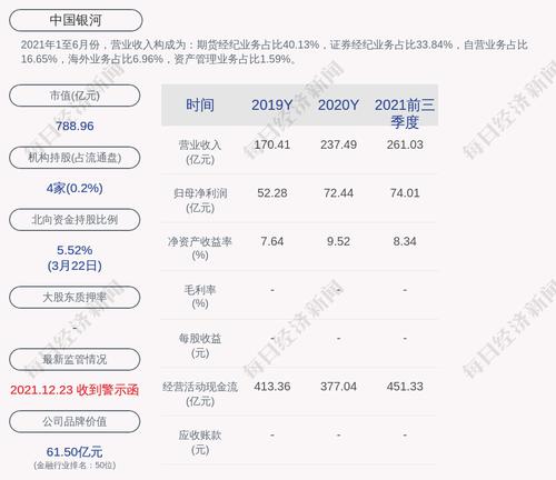 2021年1至6月份,中国银河的营业收入构成为:期货经纪业务占比40.13%,证券经纪业务占比33.84%,自营业务占比16.65%,海外业务占比6.96%,资产管理业务占比1.59%。