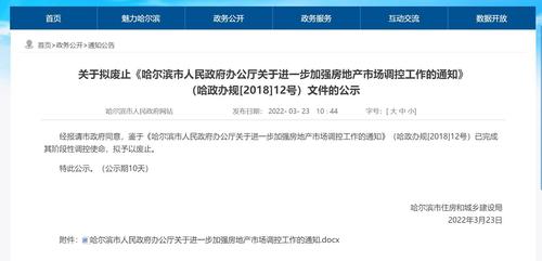 3月23日,《每日经济新闻》记者从哈尔滨市人民政府网站获悉,哈尔滨住房和城乡建设局(以下简称哈尔滨住建局)经报请市政府同意,鉴于《哈尔滨市人民政府办公厅关于进一步加强房地产市场调控工作的通知》(以下简称《调控通知》)已完成其阶段性调控使命,拟予以废止。其中就包括哈尔滨此前实行的主城区6区限售政策。