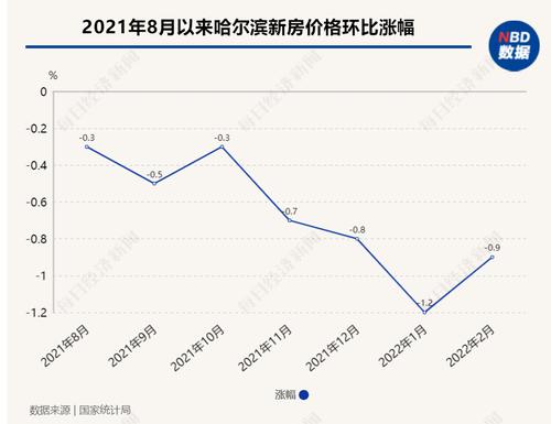据国家统计局数据,2022年2月,哈尔滨新建商品住宅销售价格环比下降0.9%,同比下降3.8%;二手房环比下降1.0%,同比下降3.4%。自去年8月份以来,哈尔滨新房销售价格环比持续下跌。